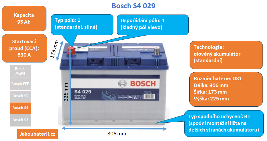 Konkrétní Bosch S4 S40 29 je už „větší“ baterie s kapacitou 95 Ah a maximálním startovacím proudem 830 A, takže se hodí do vozů s výkonnějším dieselem, do větších benzínů, případně do aut s bohatší výbavou (vyhřívání, silnější audio, přídavná elektronika), kde je potřeba jak energie v zásobě, tak silný rozběh startéru. Rozměry 306 × 173 × 225 mm odpovídají nejblíže standardu D31 (305 × 173 × 225 mm) – jste tedy prakticky přesně v této velikostní třídě. To je důležité, protože D31 je rozměr častější u asijských aplikací než u typických evropských „L“ rozměrů (L0–L6 mají obvykle šířku 175 mm a výšku 190 mm). Tady je šířka 173 mm a hlavně výška 225 mm, což jasně ukazuje na vyšší, méně „evropský“ formát.