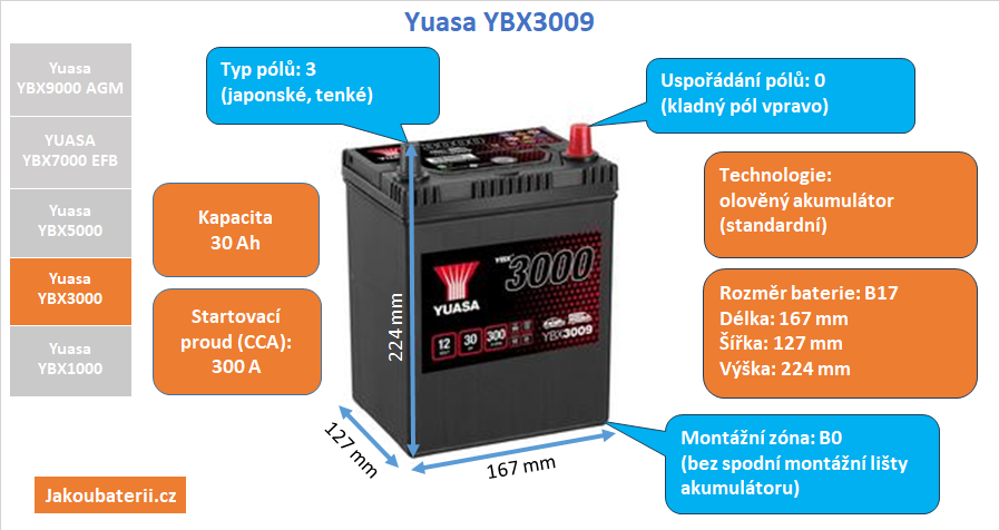 Yuasa YBX3009 je tedy vhodná volba tam, kde je rozhodující nejen kapacita a proud, ale i správný typ svorek a konkrétní způsob uchycení. V praxi se vyplatí při výměně porovnat nejen čísla, ale i detaily montáže: pevné upevnění, správné odvětrání (pokud jej vůz používá) a čisté kontakty na svorkách dokážou prodloužit životnost. Přestože jde o relativně malý akumulátor, při správném dobíjení a běžné údržbě může nabídnout spolehlivý start a stabilní provoz elektrické soustavy.